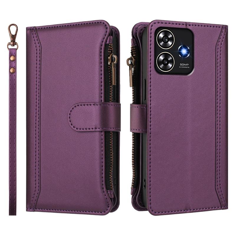 For ZTE Blade A73 4G Magnetic Closure 9 Card Slots Zipper Leather Case with Hand Strap(Purple)