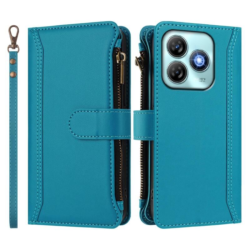 For ZTE Blade A75 4G Magnetic Closure 9 Card Slots Zipper Leather Case with Hand Strap(Turquoise)