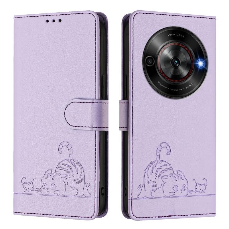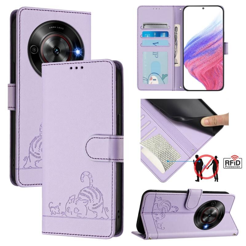 For ZTE Blade A75 5G Cat Rat Embossed Pattern RFID Leather Phone Case with Lanyard(Purple)