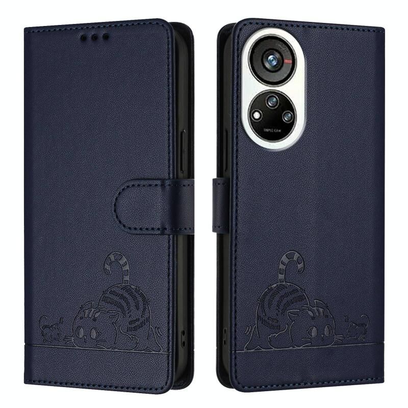 For ZTE Blade V40s Cat Rat Embossed Pattern RFID Leather Phone Case with Lanyard(Blue)