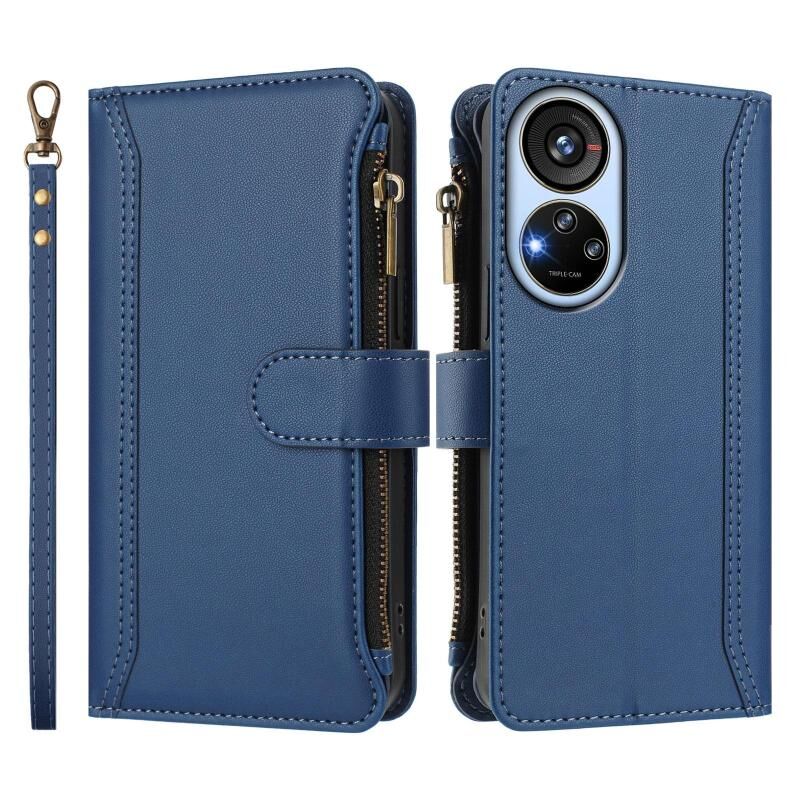 Για ZTE Blade V40s Μαγνητικό Κλείσιμο 9 Θήκες Κάρτας Δερμάτινη Θήκη με Φερμουάρ και Λουρί Χεριού (Σκούρο Μπλε)