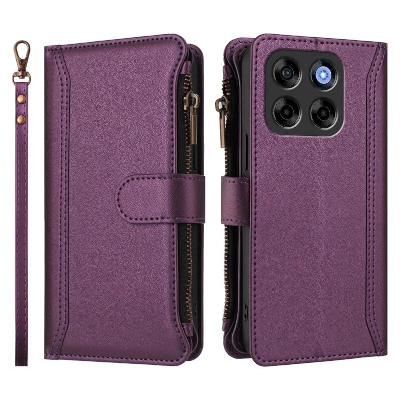 For ZTE Blade V70 Magnetic Closure 9 Card Slots Zipper Leather Case with Hand Strap(Purple)
