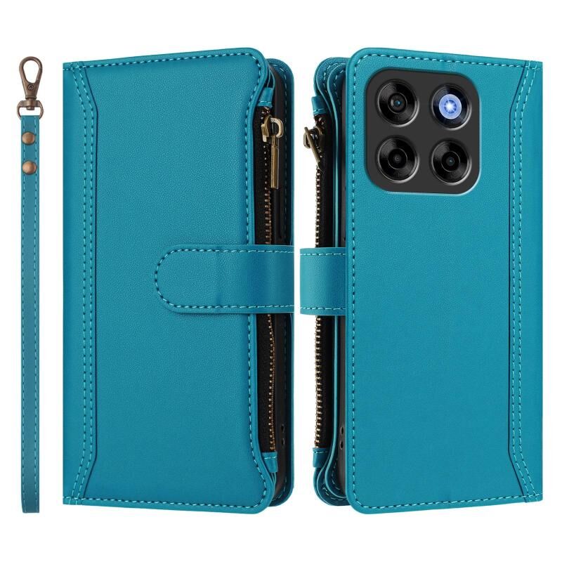 For ZTE Blade V70 Magnetic Closure 9 Card Slots Zipper Leather Case with Hand Strap(Turquoise)