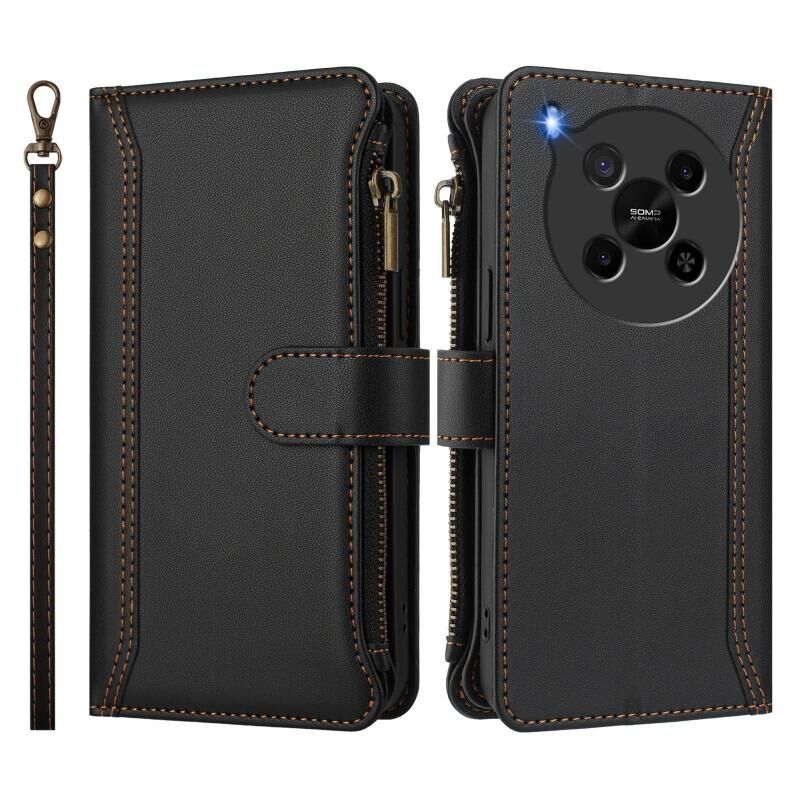 For ZTE Blade V70 Max Magnetic Closure 9 Card Slots Zipper Leather Case with Hand Strap(Black)