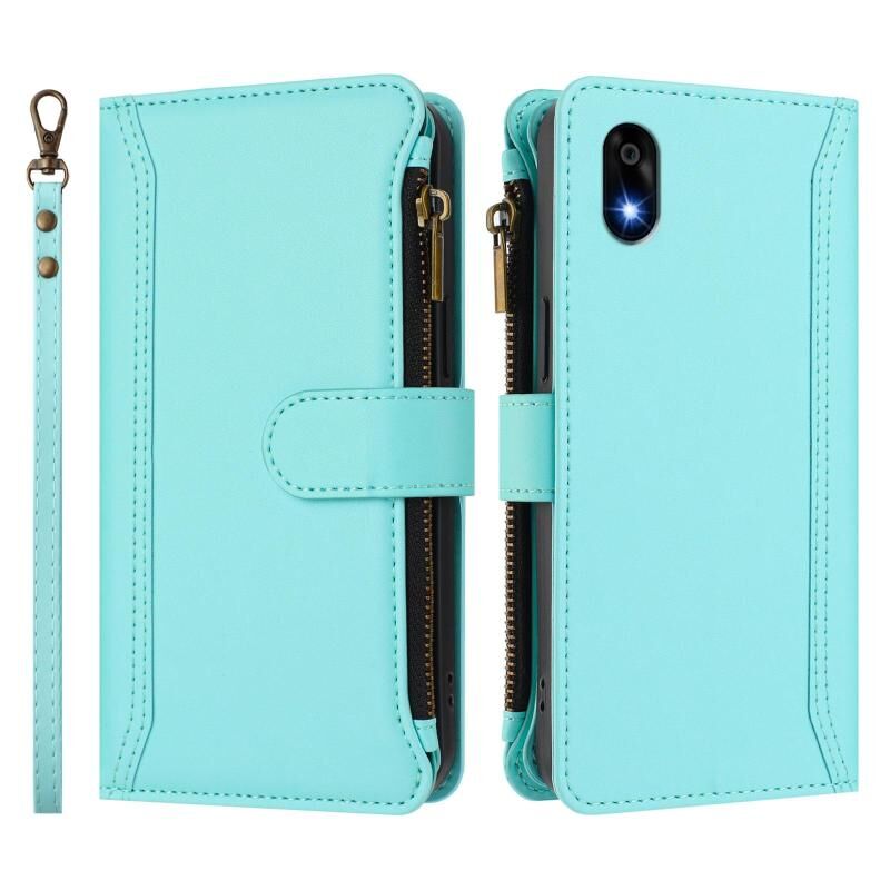 For ZTE Kantan Sumaho 4 A402ZT Magnetic Closure 9 Card Slots Zipper Leather Case with Hand Strap(Mint Green)