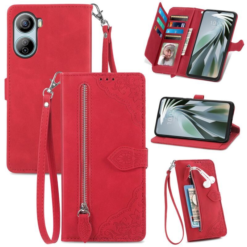 Για ZTE Libero 5G IV ανάγλυφο λουλούδι φερμουάρ δερμάτινη θήκη τηλεφώνου (κόκκινο)