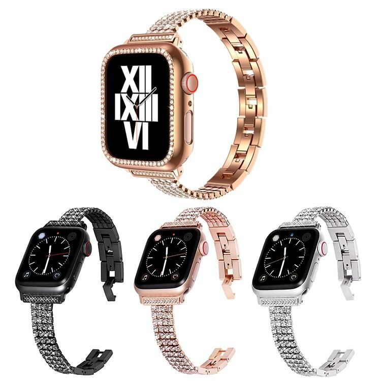 Μαύρο μεταλλικό λουρί ρολογιού με τέσσερις σειρές διαμάντια για Apple Watch Ultra 49mm & Watch Ultra 2 49mm / Series 9 & 8 & 7 45mm / SE 3 & SE 2 & 6 & SE & 5 & 4 44mm / 3 & 2 & 1 42mm.