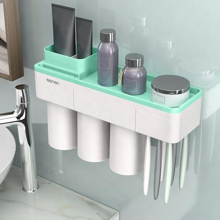 Free Punching Toothbrush Holder Set Bathroom Shelf, Style:3 Cups(Green) (MENEN)
