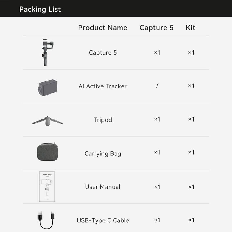 Combo έκδοση: Capture 5 gimbal x 1, τρίποδο x 1, τσάντα αποθήκευσης x 1, εγχειρίδιο χρήστη x 1, μονάδα παρακολούθησης x 1, καλώδιο δεδομένων x 1