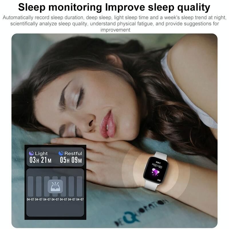 8. Functions: Bluetooth calling, body temperature monitoring, sleep monitoring, heart rate monitoring, blood pressure monitoring, 12 sports modes, Bluetooth music playback, smart message reminders, weather forecast, shake to take pictures, etc.