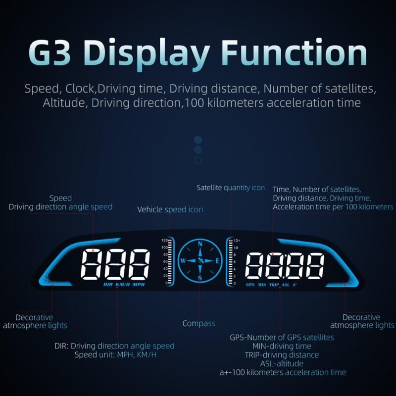 5. Εμφάνιση πληροφοριών: ταχύτητα, ώρα, αριθμός δορυφόρων, απόσταση οδήγησης, χρόνος οδήγησης, κατεύθυνση πυξίδας, γωνία κατεύθυνσης οδήγησης, υψόμετρο, χρόνος επιτάχυνσης ανά 100 χιλιόμετρα