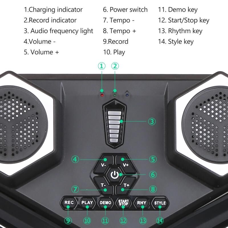 8. Digital 7-segment color screen display: display drum tone, rhythm and demonstration song status
