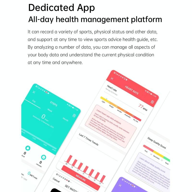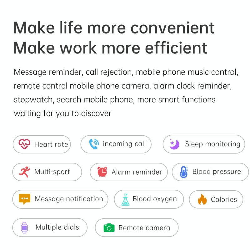 11. Functions: heart rate monitoring, blood pressure monitoring, blood oxygen monitoring, sleep monitoring, step counting, distance, calories, exercise mode, mountain climbing, cycling reminder, call reminder, SMS reminder, alarm clock, etc.