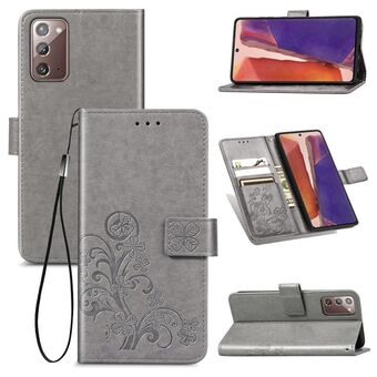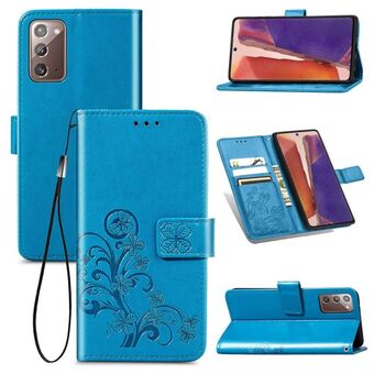 Θήκη δερμάτινη για Samsung Galaxy Note20 με σχέδιο τριφυλλιού, ανάγλυφο κούμπωμα, προστασία κινητού, λουρί, θήκη για κάρτες, πορτοφόλι και λειτουργία βάσης (Μωβ)