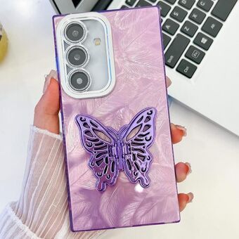 For Samsung Galaxy A55 5G Plating Glitter Texture Butterfly Holder TPU Phone Case with Lens Film(Purple Feathers)