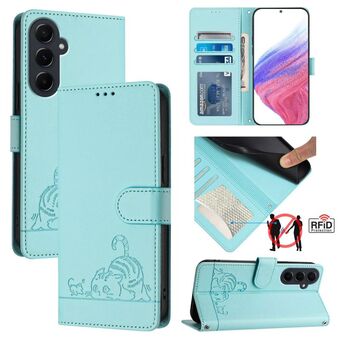 For Samsung Galaxy A55 5G Cat Rat Embossed Pattern RFID PU Phone Case with Wrist Strap(Mint Green)