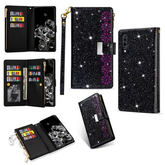For Samsung Galaxy A70 / A70s Multi-card Slots Starry Sky Laser Carving Glitter Zipper Horizontal Flip Leather Case with Holder & Wallet & Lanyard(Black)