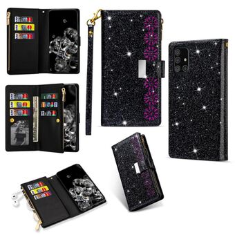 For Samsung Galaxy A51 Multi-card Slots Starry Sky Laser Carving Glitter Zipper Horizontal Flip Leather Case with Holder & Wallet & Lanyard(Black)