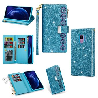 For Samsung Galaxy S9 Multi-card Slots Starry Sky Laser Carving Glitter Zipper Horizontal Flip Leather Case with Holder & Wallet & Lanyard(Sky Blue)