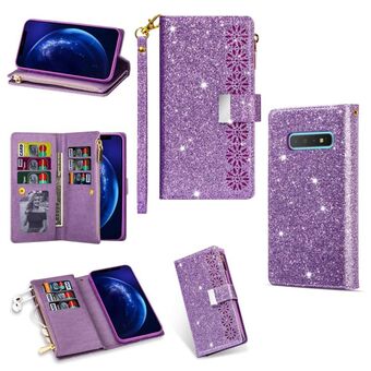 For Samsung Galaxy S10 Multi-card Slots Starry Sky Laser Carving Glitter Zipper Horizontal Flip Leather Case with Holder & Wallet & Lanyard(Purple)