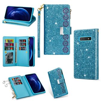 For Samsung Galaxy S10+ Multi-card Slots Starry Sky Laser Carving Glitter Zipper Horizontal Flip Leather Case with Holder & Wallet & Lanyard(Sky Blue)