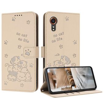 For Samsung Galaxy XCover 7 Embossed Kitten Phone Leather Case with Lanyard(Beige)