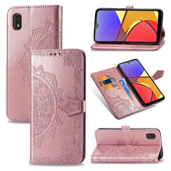 For Samsung Galaxy A21 (JP Version) Mandala Flower Embossed Horizontal Flip Leather Case with Bracket / Card Slot / Wallet / Lanyard(Rose Gold)