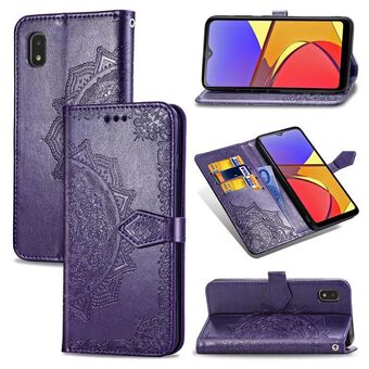 For Samsung Galaxy A21 (JP Version) Mandala Flower Embossed Horizontal Flip Leather Case with Bracket / Card Slot / Wallet / Lanyard(Purple)
