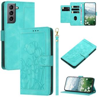 For Samsung Galaxy S21+ 5G Tulips Embossed Leather Phone Case with Lanyard(Green)
