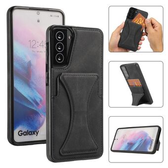 Θήκη δέρματος οριζόντιας αναδίπλωσης PU + TPU με επιμετάλλωση μπρούτζου για Samsung Galaxy S21 5G με βάση & υποδοχή κάρτας (Μαύρο)