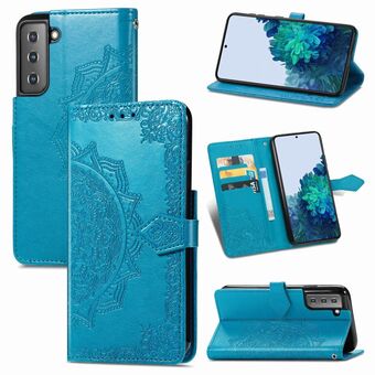 Θήκη Samsung Galaxy S21 5G, Δερμάτινη οριζόντια θήκη με σχέδιο Mandala, λουλούδι σε ανάγλυφο, με βάση & τρεις θήκες για κάρτες & πορτοφόλι & κορδόνι (Μπλε)