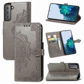 Θήκη Samsung Galaxy S21 5G, δερμάτινη οριζόντια με σχέδιο Mandala, ανάγλυφο λουλούδι, με βάση & τρεις θήκες για κάρτες & πορτοφόλι & λουρί (Μαύρο)