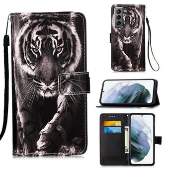 Θήκη δέρματος οριζόντιας αναδίπλωσης για Samsung Galaxy S21 5G με σχέδιο πολύχρωμης ζωγραφικής, απλή ύφανση, με βάση & υποδοχή κάρτας & πορτοφόλι & κορδόνι (Τίγρης σε Ασπρόμαυρο)