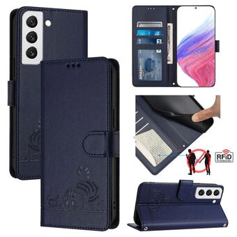 For Samsung Galax S22 Cat Rat Embossed Pattern RFID PU Phone Case with Wrist Strap(Blue)