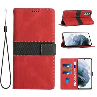 For Samsung Galaxy S22 5G Grid Stitching Leather Phone Case with Lanyard(Red)