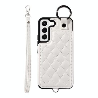 For Samsung Galaxy S22 5G Rhombic Texture Card Bag Phone Case with Short Lanyard(White)