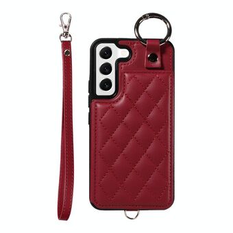 For Samsung Galaxy S22 5G Rhombic Texture Card Bag Phone Case with Short Lanyard(Wine Red)