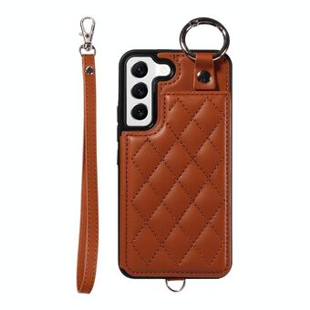 For Samsung Galaxy S22 5G Rhombic Texture Card Bag Phone Case with Short Lanyard(Brown)