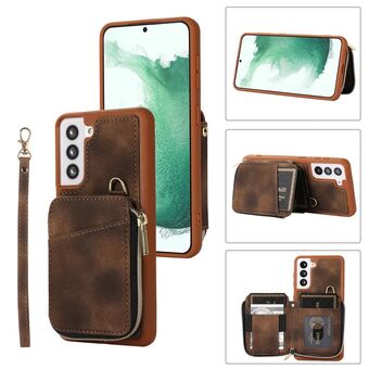 For Samsung Galaxy S22+ 5G Zipper Card Bag Phone Case with Dual Lanyard(Brown)