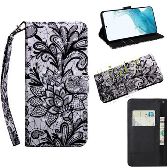 Θήκη τηλεφώνου Samsung Galaxy S22+ 5G, δερμάτινη, οριζόντια αναδιπλούμενη με τρισδιάστατο σχέδιο, βάση στήριξης & λουρί (Μαύρο Δαντέλα)