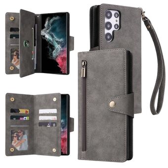Για Samsung Galaxy S22 Ultra 5G Rivet πόρπη 9 κάρτες τρεις φορές δερμάτινη θήκη τηλεφώνου (γκρι)