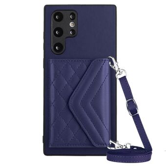 For Samsung Galaxy S22 Ultra 5G Rhombic Texture Card Bag RFID Phone Case with Long Lanyard(Blue)