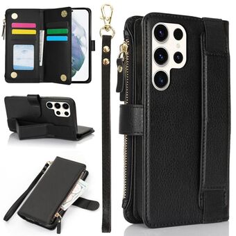 Για Samsung Galaxy S22 Ultra 5G Wristband κάτοχος φερμουάρ πορτοφόλι RFID δερμάτινη θήκη τηλεφώνου (Μαύρο)