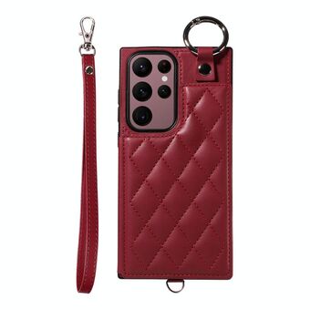 Για Samsung Galaxy S22 Ultra 5G Rhombic υφή κάρτα τσάντα υπόθεση τηλεφώνου με σύντομο κορδόνι (κόκκινο κρασί)