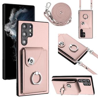 For Samsung Galaxy S22 Ultra 5G Organ Card Bag Ring Holder Phone Case with Long Lanyard(Pink)
