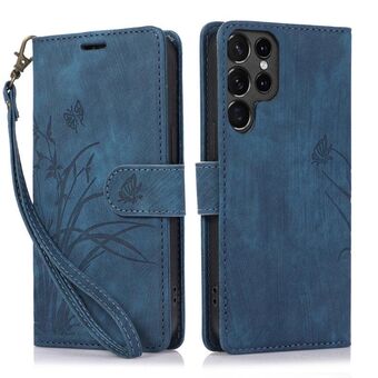 For Samsung Galaxy S22 Ultra 5G Orchid Butterfly Embossed Leather Phone Case(Blue)