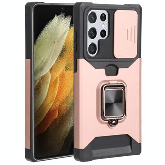Για Samsung Galaxy S22 Ultra 5G συρόμενη κάμερα Cover Design PC + TPU Shockproof υπόθεση τηλεφώνου με θήκη δαχτυλίδι & υποδοχή κάρτας (Rose Gold)