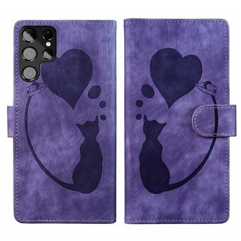 For Samsung Galaxy S22 Ultra 5G Pen Heart Cat Embossed Leather Phone Case(Purple)