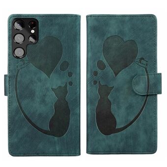 For Samsung Galaxy S22 Ultra 5G Pen Heart Cat Embossed Leather Phone Case(Green)