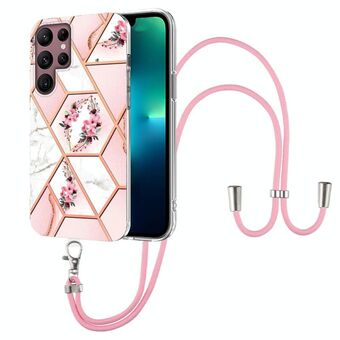 For Samsung Galaxy S22 Ultra 5G Splicing Marble Flower Pattern TPU Phone Case with Lanyard(Pink Flower)